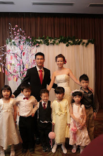 For Geoh Peng, a turquoise, red and white theme, but we kept the cake just red and white. Cupcake wrappers were brought back from Melbourne. I should have rearranged the colour combination the other way, starting from white as the bottom tier. With cupcake towers, you can only visualize the outcome in your head prior to set up. That's because you have to consider the colour of the boards, the separators, the cupcakes, the decorated area between the table and the first tier, the table itself...all these to be 'seen' eye level, as how the wedding guests would see them.